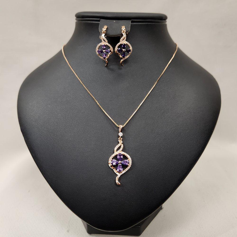 Expertly crafted and adorned with sparkling round and pear-shaped purple stones, our three-piece jewelry set is sure to make a statement. The delicate gold color frame adds a touch of elegance, while the included chained necklace and dangle earrings provide versatile options for any occasion. Plus, the pushback post on the earrings ensures a secure and comfortable fit. Elevate your look with this stunning set.